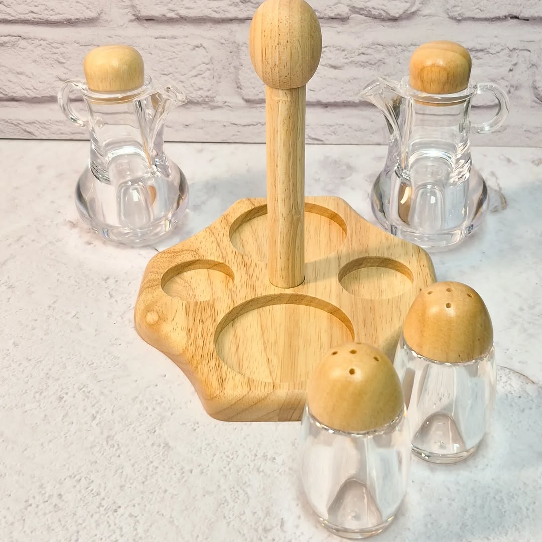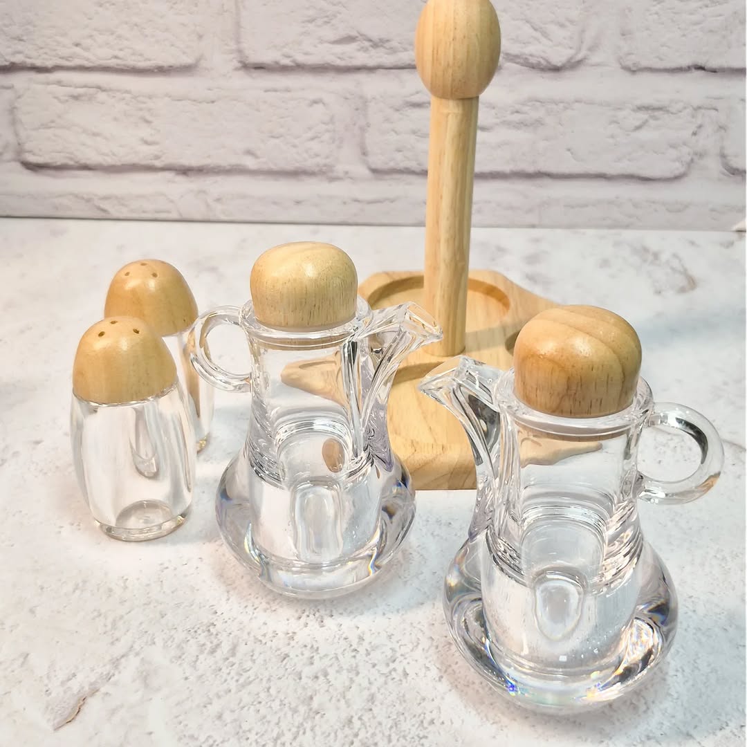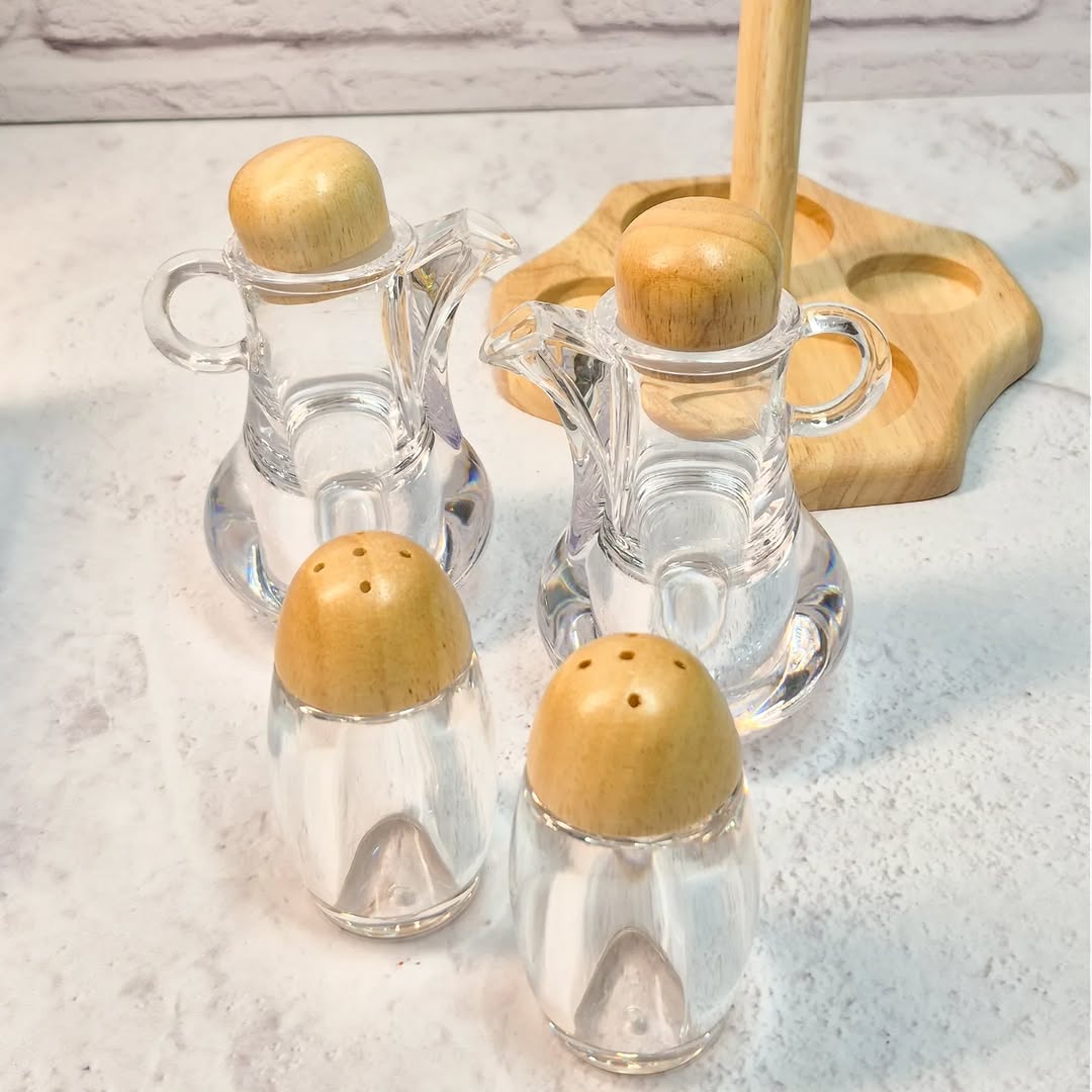 ست آبلیمو و نمکدان رومیزی 🔥😍وارداتی این تصویر یک ست نمکدان و فلفلدان رومیزی با پایه چوبی است که شامل موارد زیر میشو:اجزاء:این ست شامل دو ظرف اکرولیک برای نمک و فلفل با درپوش چوبی، ، و دو جا روغنی/سرکه خوری اکرولیک با درپوش چوبی است. همه اینها بر روی یک پایه چوبی قرار گرفتهاند. کاربرد:این ست برای نگهداری و سرو نمک، فلفل، شکر و روغن یا ،آبلیمو سرکه در سر میز غذا مناسب است. سبک:طراحی چوبی و اکرولیک آن میتواند به عنوان یک عنصر دکوری زیبا در آشپزخانه یا میز غذا نیز عمل کند.